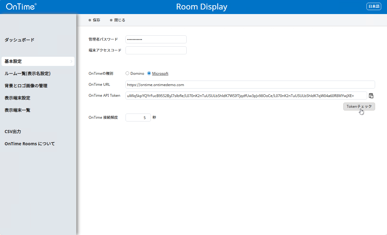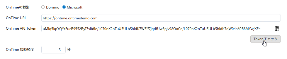 あらかじめOnTimeサーバーで準備したTokenを設定します。準備方法は各設定マニュアルを参照ください。