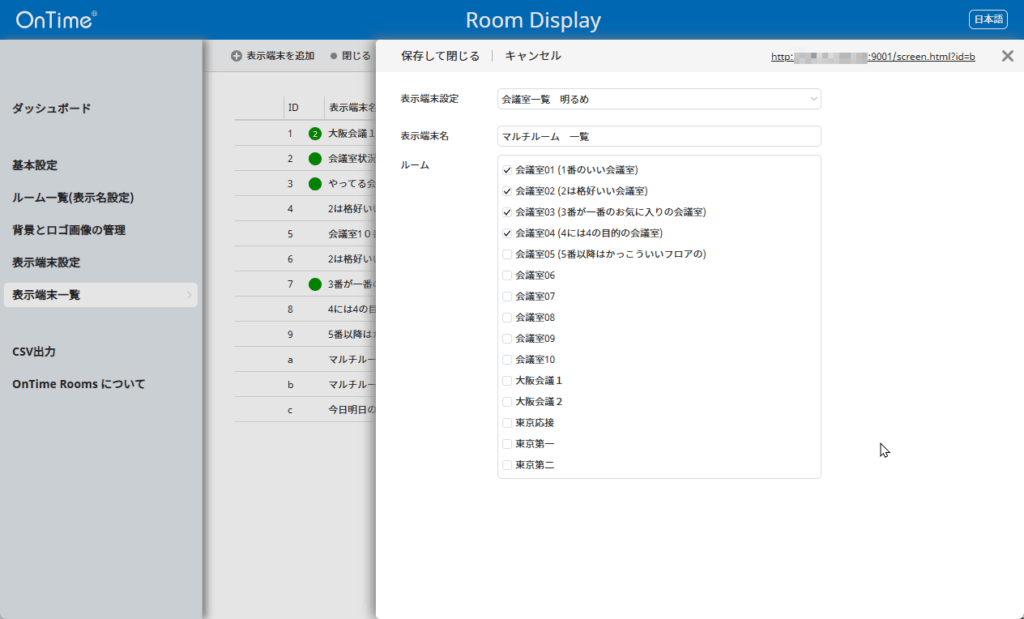 「一覧表示・会議室別」用表示端末の設定 表示端末設定の選択 一覧表示・会議室別用に準備した表示端末設定から利用する設定を選択します。 利用する会議室を選択 会議室を複数選択します。端末に表示される「表示端末名」を登録します。 設定を保存します...